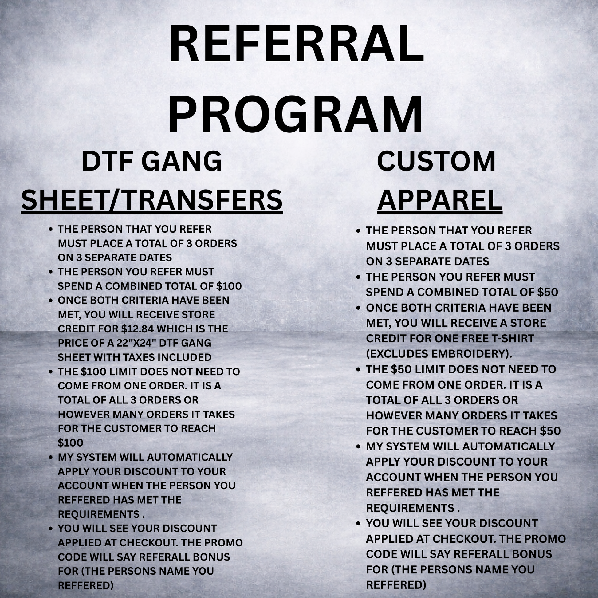 Please fill this out when you refer someone NEW so that you will receive a store credit when they meet the requirements. YOU MUST BE SIGNED INTO YOUR ACCOUNT